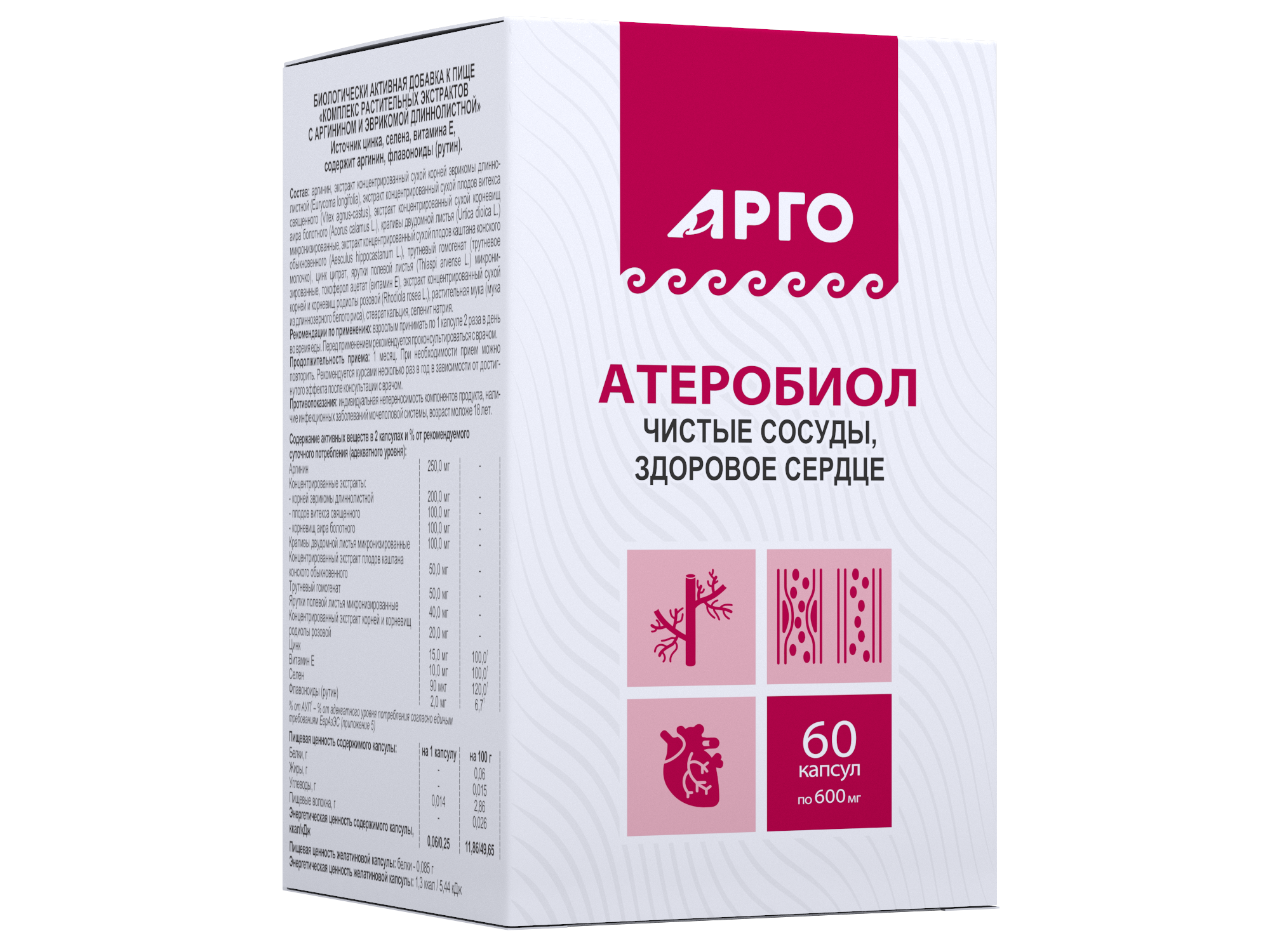 Anti-oxidants of the complex: coenzime Q10 (coferment), L-carnitine, alpha-lipoic acid, spirulina participate in energy supply of cells, they neutralize free radicals, provide normal course of immune reactions in the body, protect the body against oxidative stress. Antioxidants facilitate normalization of arterial blood pressure, strengthen the myocard, reduce the risk of infarction, protect and maintain stable functioning of the heart, including under heavy duty, increase working capacity and physical stamina, slow aging.