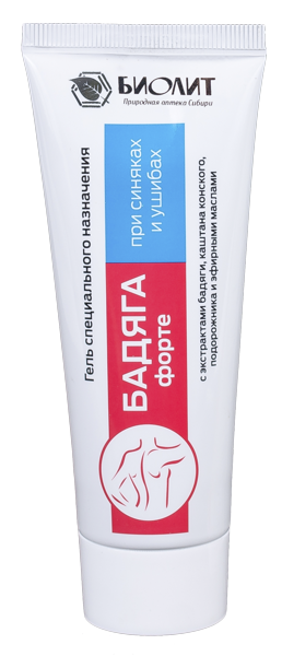 Badyaga Forte gel strengthens blood vessels and relieves pain, heals burns, abrasions, insect bites, and improves skin condition in cases of acne.