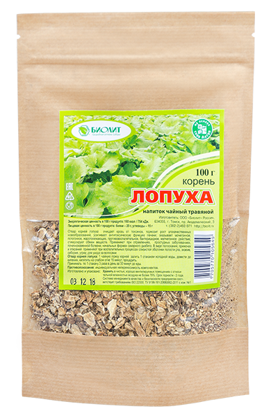 Burdock roots contain up to 12.5 % of protein, essential oils (up to 0.17 %), tannins, amarines, palmitic and stearic acids, sitosterol, phytosterol, stigmasterol, gum, tar, micro- and macroelements (copper, titan, boron, manganese, strontium, zink, tin, vanadium and iron); soluble dietary fibers.