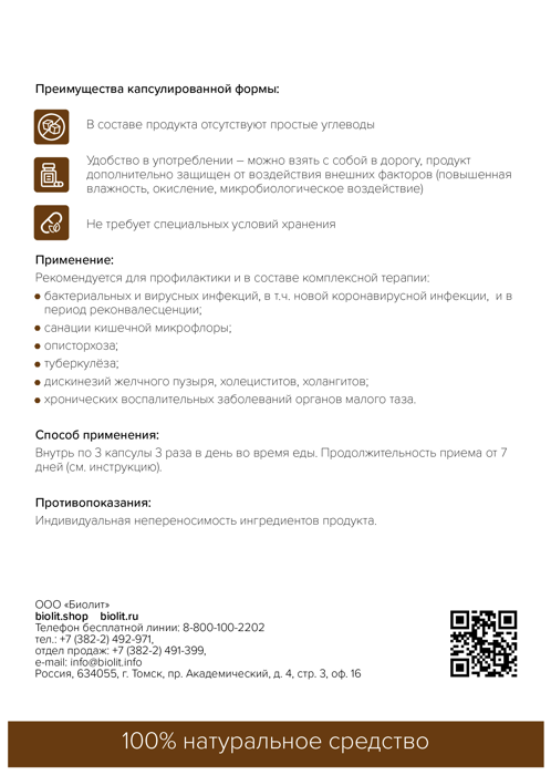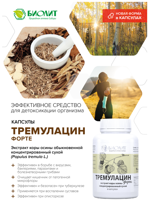 Aspen bark extract is a plant analog of bile acids, is a powerful natural antibiotic, cleanses the microbiota from parasites, pathogenic bacteria, viruses and fungi. It promotes active recovery in cases of opisthorchiasis, tuberculosis, pneumonia and bronchitis.
